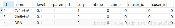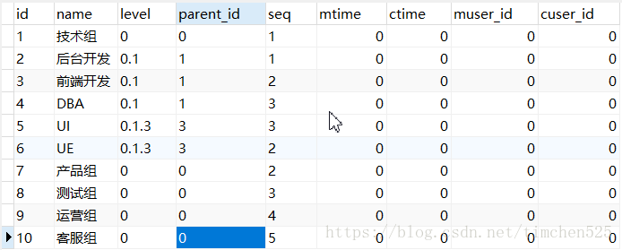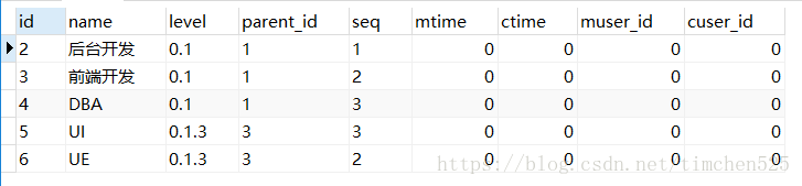 UE(id是6)是属于前端开发(id是3),而前端开发是属于技术组(id是1),因此,UE的level是0.1.3 依次为顶级的id到最靠近自己的id。